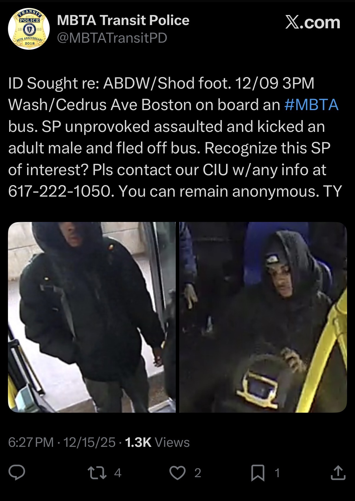 BOSTON — Transit police are searching for a suspect after a random and unprovoked assault aboard an MBTA bus in Dorchester, where a passenger was kicked by a stranger before the attacker fled.
