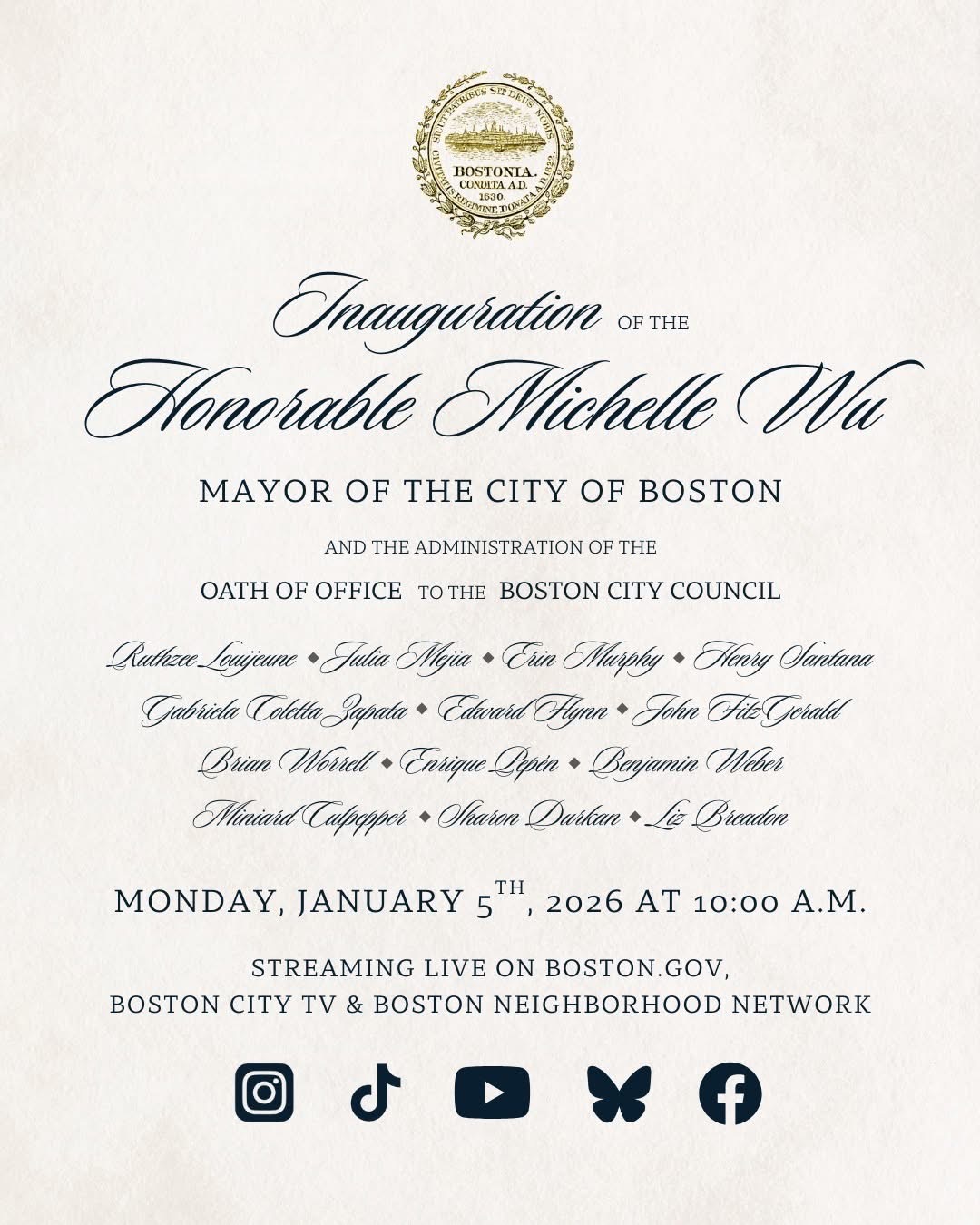 The inauguration will take place Monday, January 5 at 10:00 a.m. and will be livestreamed across platforms including Instagram, TikTok, YouTube, Bluesky, Facebook, Boston.gov, Boston City TV, and the Boston Neighborhood Network. City Hallâs announcement emphasized digital viewing, with no clear details provided about public, in-person access. As of publication, the livestream appears to be the primary â and possibly only â way to watch. If there is a broader guest list, Mass Daily News assumes it would not be the first outlet to receive an invitation.