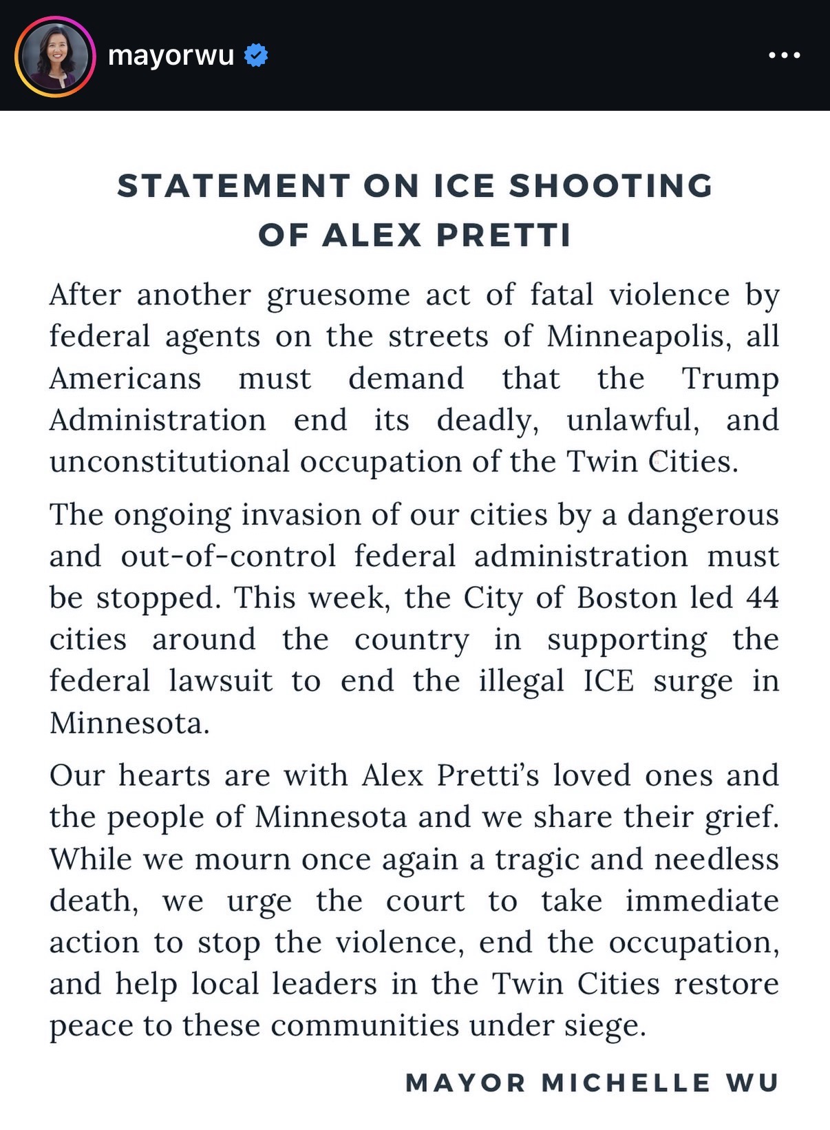 Wu didn’t just offer sympathy. She went straight for the megaphone — accusing the Trump Administration of a “deadly, unlawful, and unconstitutional occupation” of the Twin Cities, calling it an “invasion,” and branding the federal response “dangerous and out-of-control.” She urged the courts to step in immediately to “stop the violence,” “end the occupation,” and restore peace to what she described as communities “under siege.”