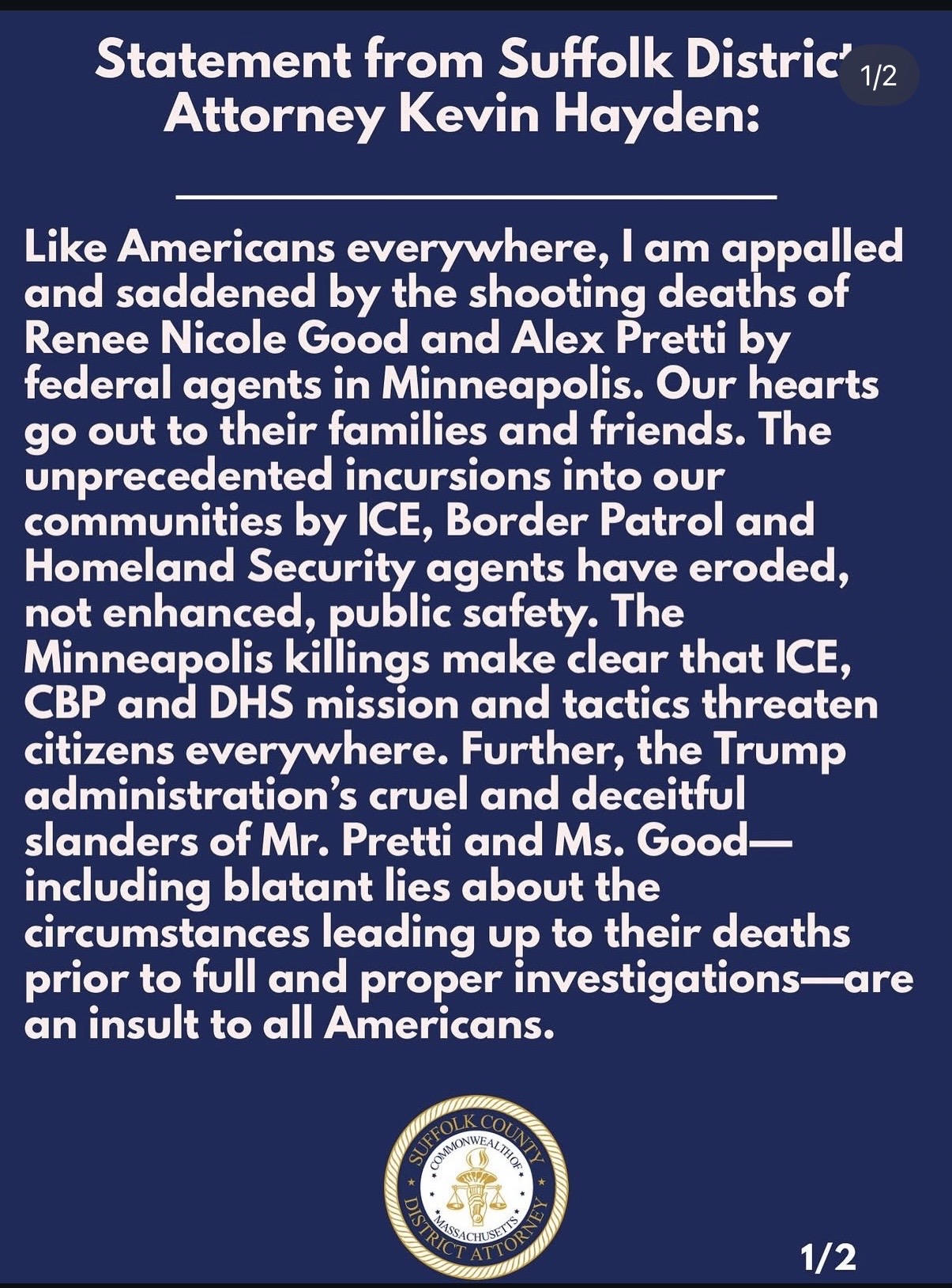 The statement comes as the country remains on edge following the fatal shootings of Renée Nicole Good and Alex Pretti, both killed by federal agents in Minneapolis in separate encounters that have ignited protests, outrage, and calls for accountability nationwide.