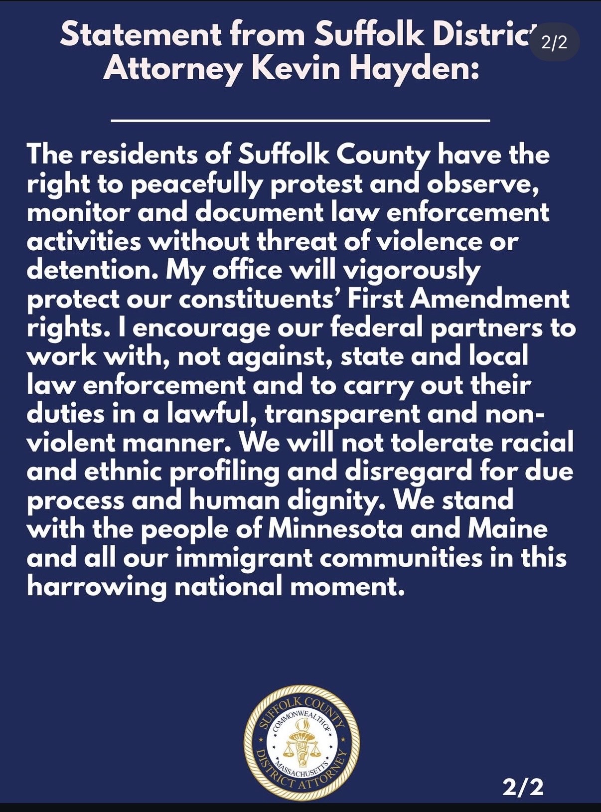 BOSTON — At a moment of national unrest and growing distrust of federal law enforcement, Suffolk County District Attorney Kevin Hayden has taken a highly charged stand, declaring that residents have the right to “observe, monitor and document” ICE and other federal agents operating in their communities.